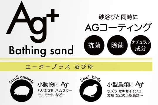 エージープラス 浴び砂は砂浴びと同時に皮膚や毛、羽にAg+(エージープラス)をコーティングすることで持続性の高い臭いの元となる雑菌を除菌・抗菌効果を発揮するという特徴を持っています。