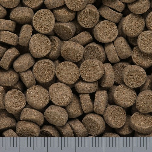 【使用原料】 カニガラ粉末、大豆ミール、フィッシュミール、エンドウ豆繊維、ビール酵母、オキアミミール、食物繊維、魚油、卵黄粉末、イカミール、スピルリナ、アミノ酸(メチオニン)、生菌剤、フミン酸、カロチノイド、ガーリック、ビタミン類(塩化コリン, E, C, イノシトール, B5,B2,A,B1,B6,B3,葉酸,D3,ビオチン)、ミネラル類(Fe,Mg,Zn,Mn,Cu,I)